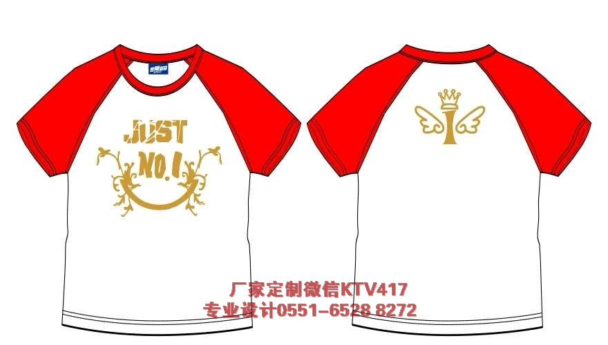 1班服裝圖片,此款班服采用的是紅色插肩袖T恤衫,這款顏色的衣服,班級采用的很多。款式比較經典。前面印JUST NO.1,背面是1加皇冠,翅膀。