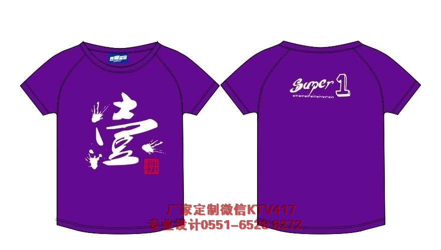 一班班級(jí)文化衫圖案紫色圓領(lǐng)文化衫,前面印大寫的壹,后面是SUPER1