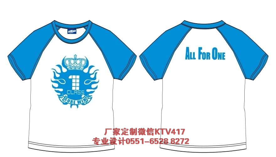 藍(lán)色一班班級(jí)文化衫圖案,CLSS ONE,后面寫ALL FOR ONE,采用的是藍(lán)色圓領(lǐng)T恤,很清爽。。