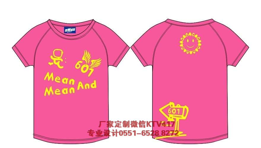 粉色的一班班衫采用的是玫紅色的圓領(lǐng)短袖全棉T恤,玫紅色的衣服前面印飛翔601,代表著六年級1班,后面是太陽笑臉,黃色的印在玫紅的衣服上很喜慶!