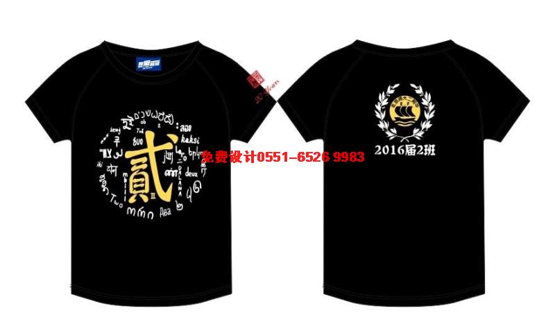 這款班服采用的黑色T恤做班服底衫,正面圖案是白色的花紋印大寫黃色的貳,衣服后面是白色的麥穗中間是2班班徽,下面落款是2016屆2班