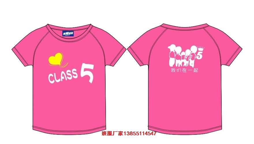 5班班服圖案,五班版衫圖片,該班服采用的是圓領(lǐng)粉色文化衫,前面印刷黃色的愛心和CLASS5,后面是卡通人物我們在一起。