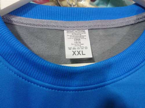 我廠圓領藍色衛(wèi)衣領口,加絨加厚面料領口特寫: