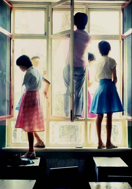 80年代的中學(xué)校園,有日光下踩著窗沿擦玻璃的女學(xué)生,在操場上或沉靜閱讀或俯身討論的同學(xué),而更多的是一些局部和細(xì)節(jié):陽光曬得棕黃的腿,穿著涼鞋的腳,黑底碎花的泳衣輕貼的后背,還有深藍(lán)無袖外衫內(nèi)搭雪白襯衣的校服領(lǐng)口。