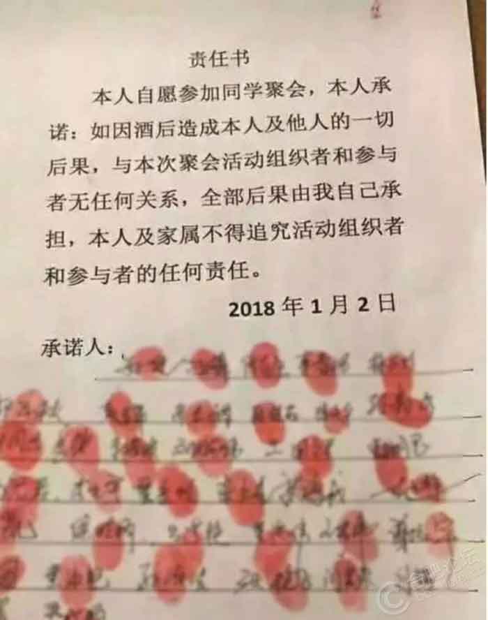 許久未見的同學(xué)朋友之間也要聚聚。聚會免不了要喝酒,近日于是所謂的“免責(zé)承諾書”出現(xiàn)了,