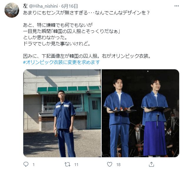 日本網(wǎng)友說:左邊的是韓國囚服,右邊雙人的是2021日本奧運(yùn)會(huì)服裝.出奇的像!